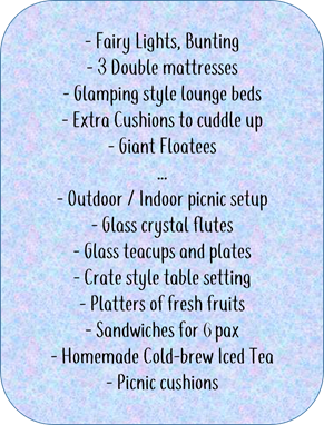 Thanks to the kind folks at Glamping Society, I am giving away one SLEEPOVER & PICNIC UNDER THE STARS package (Worth $399 and perfect for 6 pax) to one blessed reader of The J Babies! This package includes the following (basically what you see in this post!)