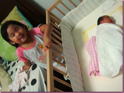 She’s extremely protective of her little sister, and tells us things like, ‘Mei Mei can hear Jie Jie’s voice, that’s why she opened her eyes leh..’, or ‘My Mei Mei wants to play with me leh…’. She even told my MIL, ‘Mei Mei wants her Jie Jie, not you, Nai Nai…’ Hahaha…